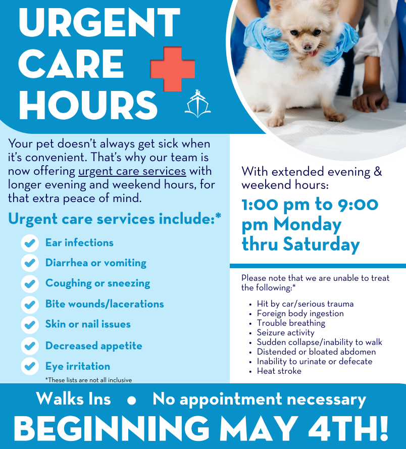 Noah's Animal Hospitals North is evolving! We are launching new urgent care hours to provide your pets with high-quality, non-emergency medical attention when they need it most.